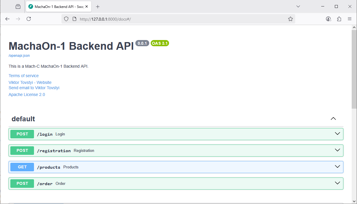 Here, you can test all available REST endpoints of the Machcon-C1 Backend interactively.